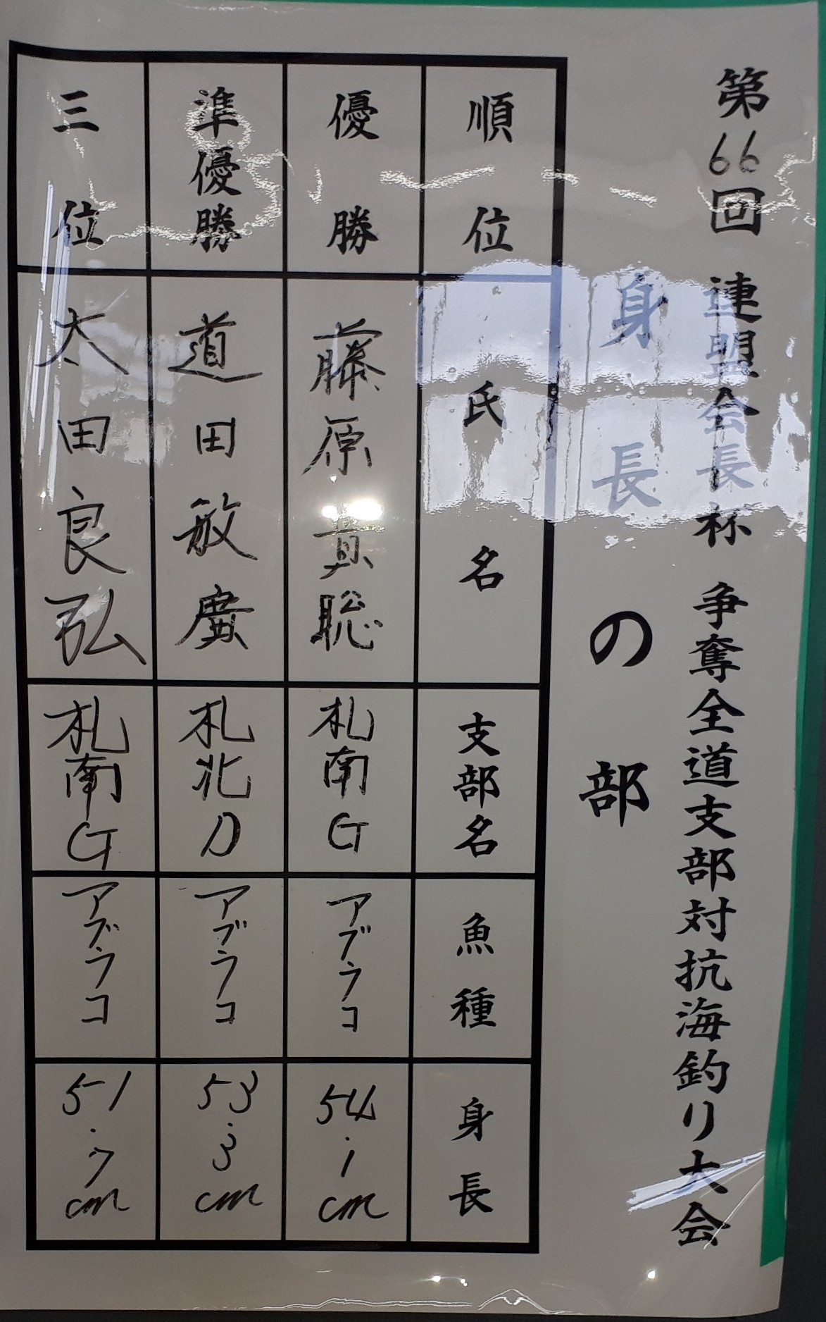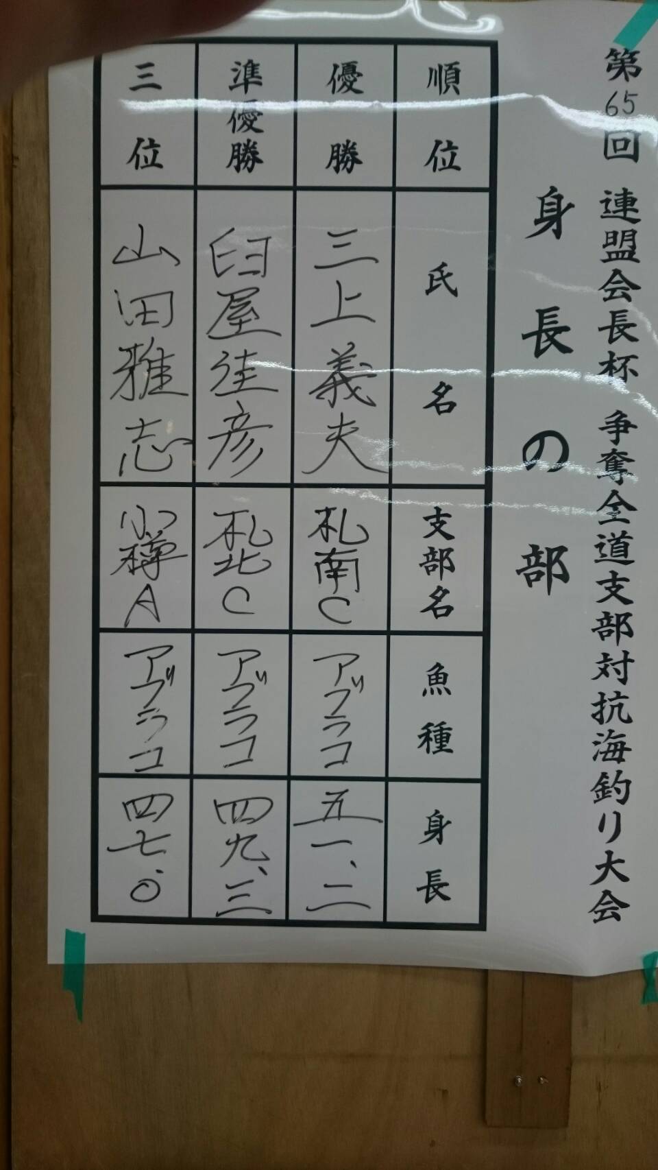 個人身長賞では、「北海磯釣り」の藤原貴聡さんが54.1センチのアブラコで優勝、同じく「北海磯釣り」の太田良弘さんが51.7センチのアブラコで3位でした。同じチームから身長賞受賞者が2人もでました('Д') 注:身長優勝の藤原さんの写真を撮り忘れました・・・、m(__)m